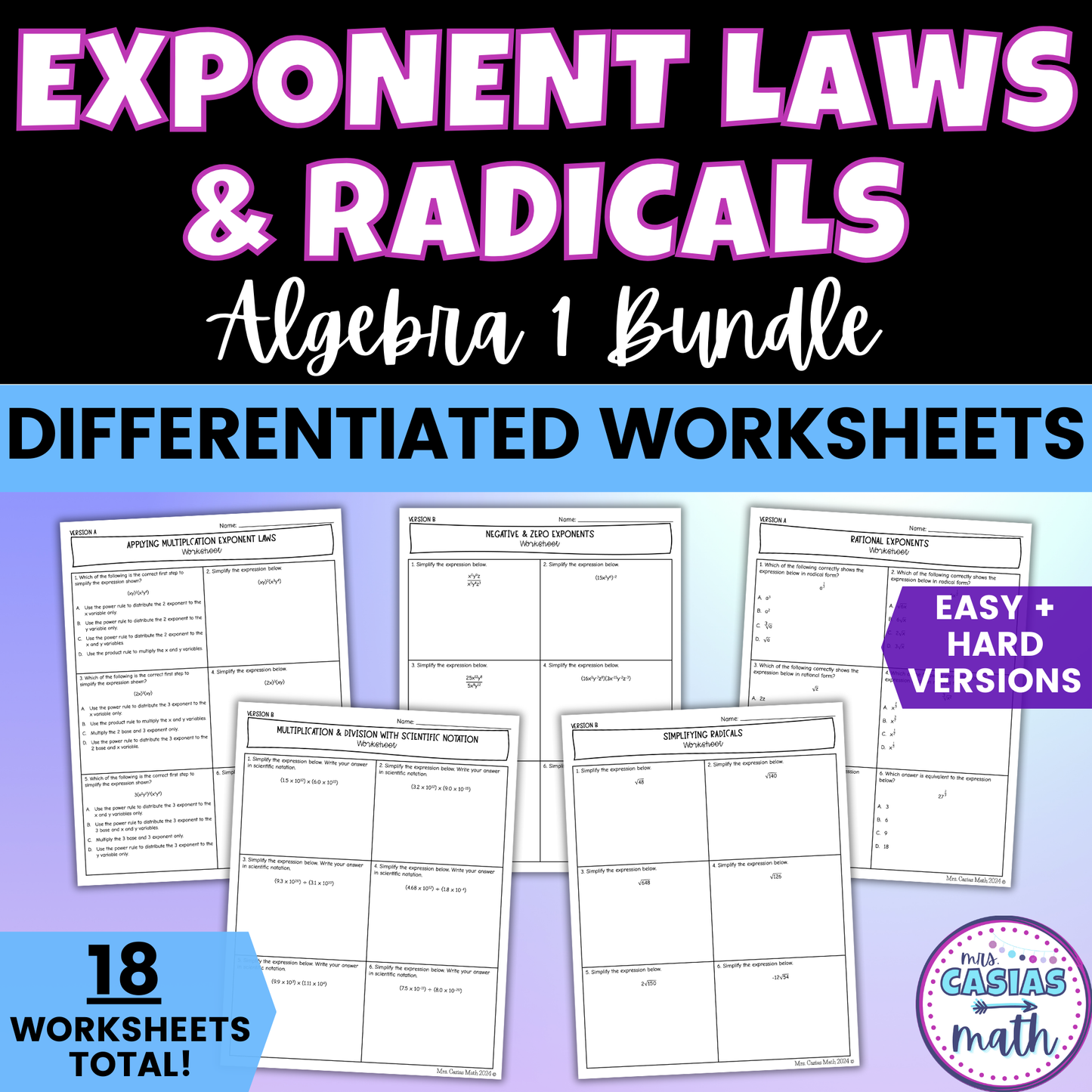 This Algebra 1 bundle includes 18 no-prep differentiated Exponents worksheets. Each of the 9 exponent laws and radicals topics include two differentiated and leveled worksheets. They are the perfect way for your students to practice exponent rules - product rule, power rule, quotient rule, negative exponents, zero exponents - plus simplifying radicals and more no matter their level as the differentiation is already done for you!