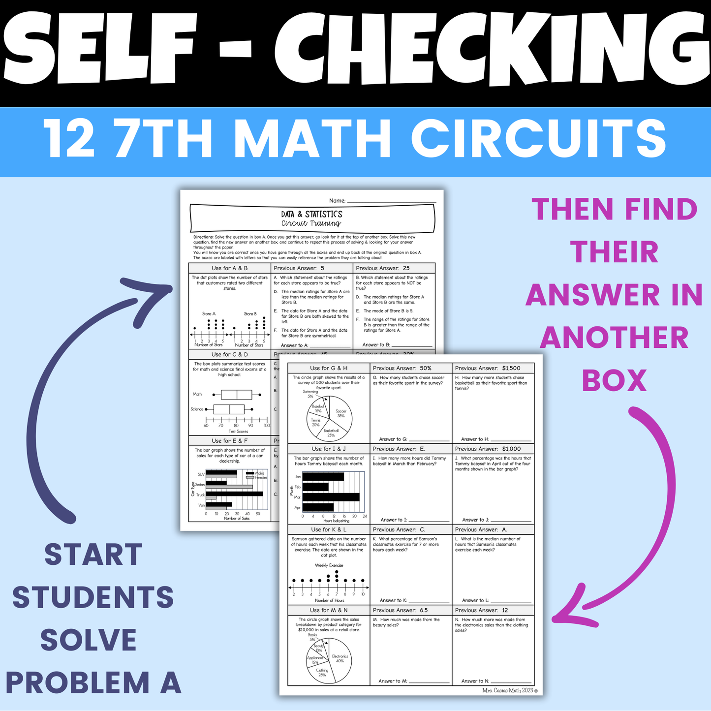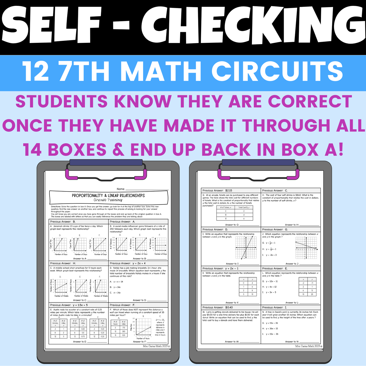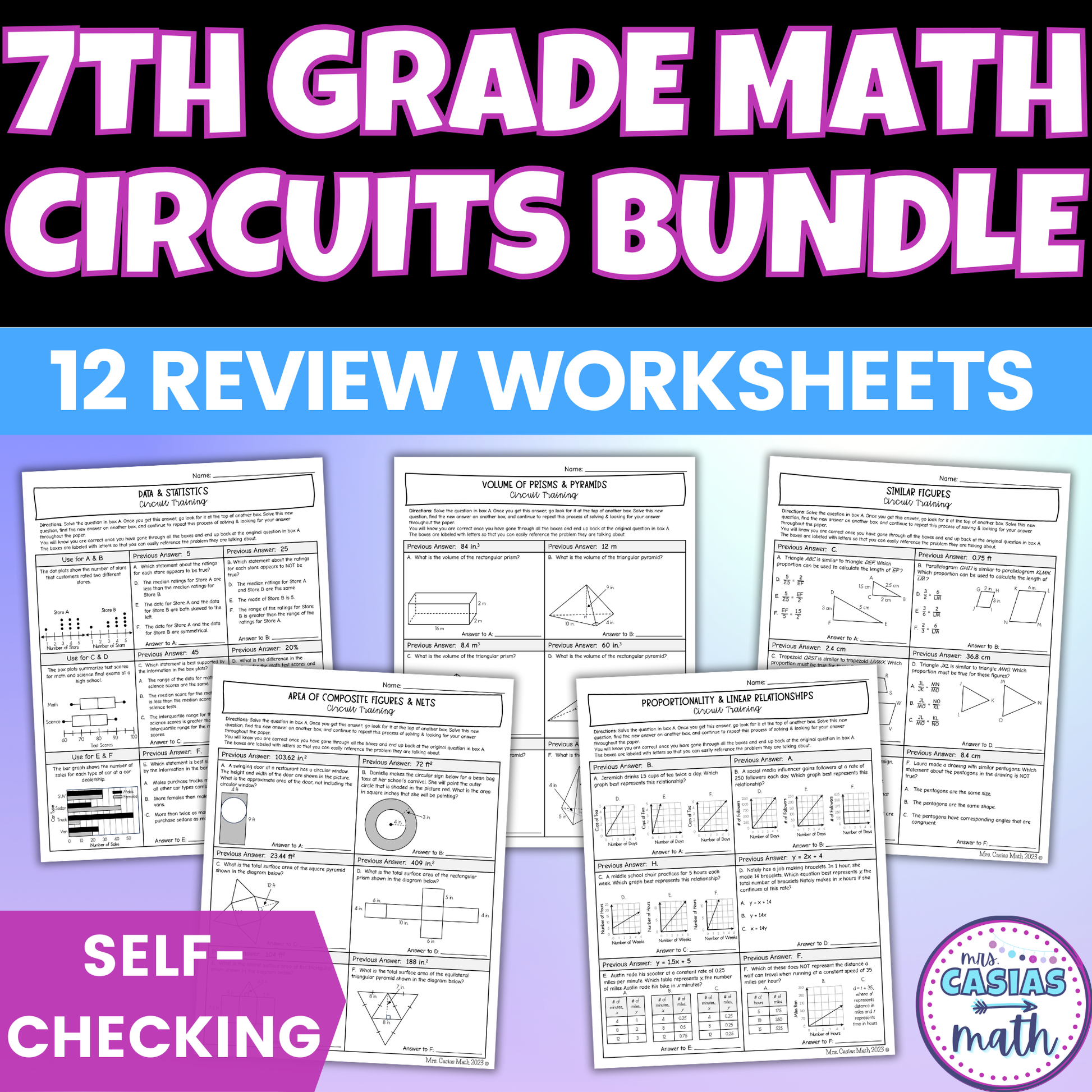 Are you looking for 7th Grade Math Review Worksheets? You will find that here with this 7th Grade Math Review Activities Bundle! Each of the 12 circuit training activities contain 14 self-checking problems over the following topics (the links below will take you to the individual resources on TPT):