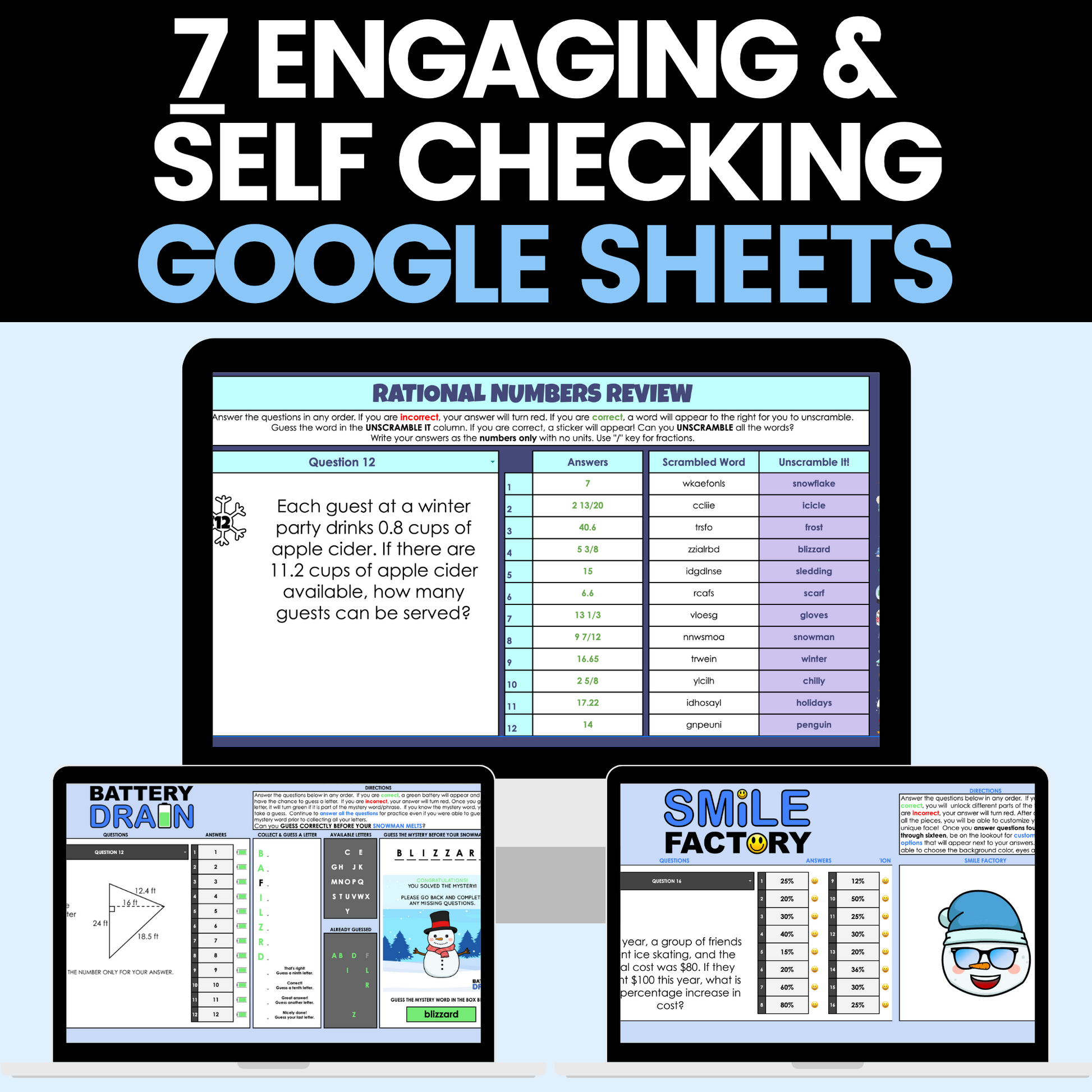 This fun seasonal bundle includes seven interactive, self-checking Google Sheets activities and printable worksheets designed for 7th grade math students!