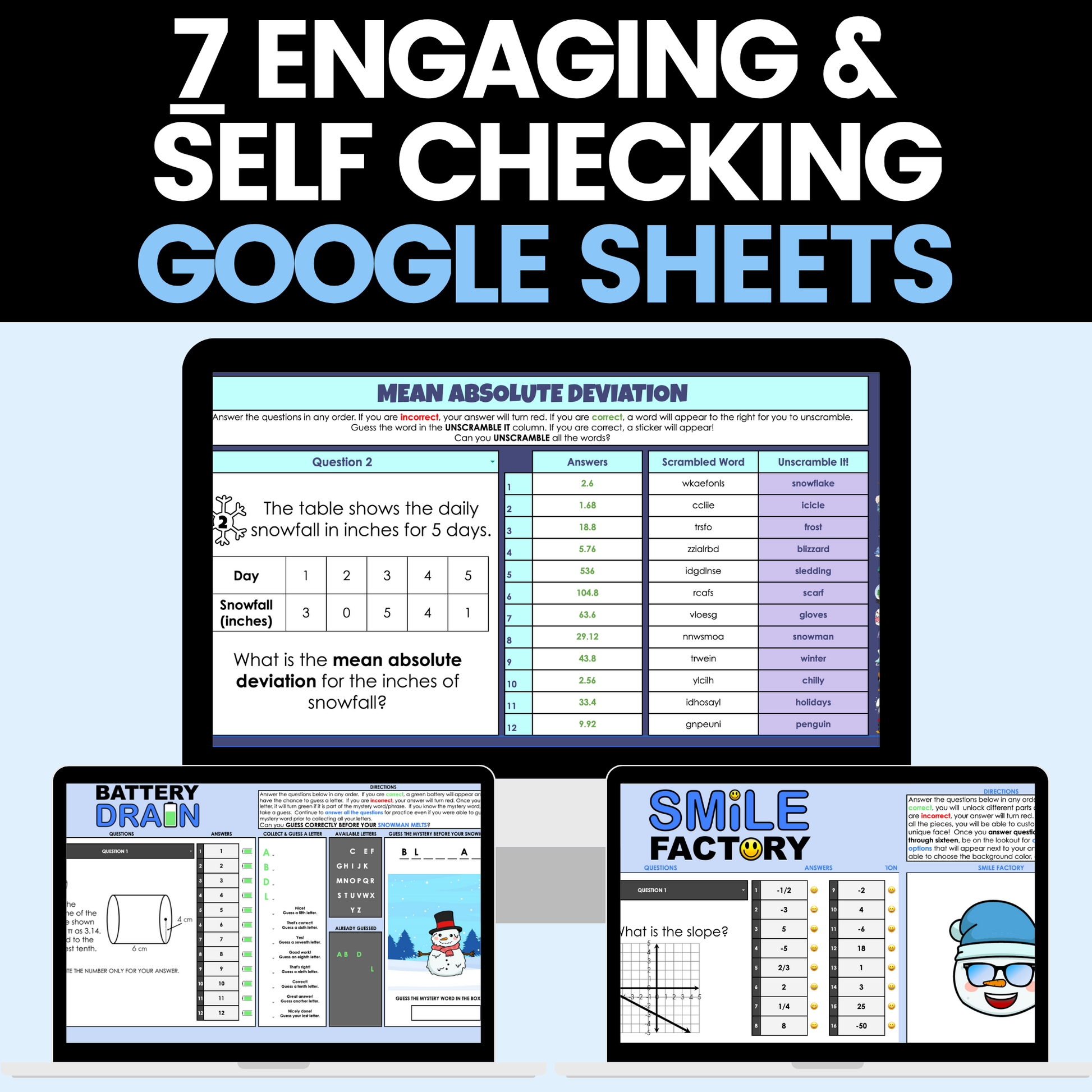 This fun seasonal bundle includes seven interactive, self-checking Google Sheets activities and printable worksheets designed for 8th grade math students!