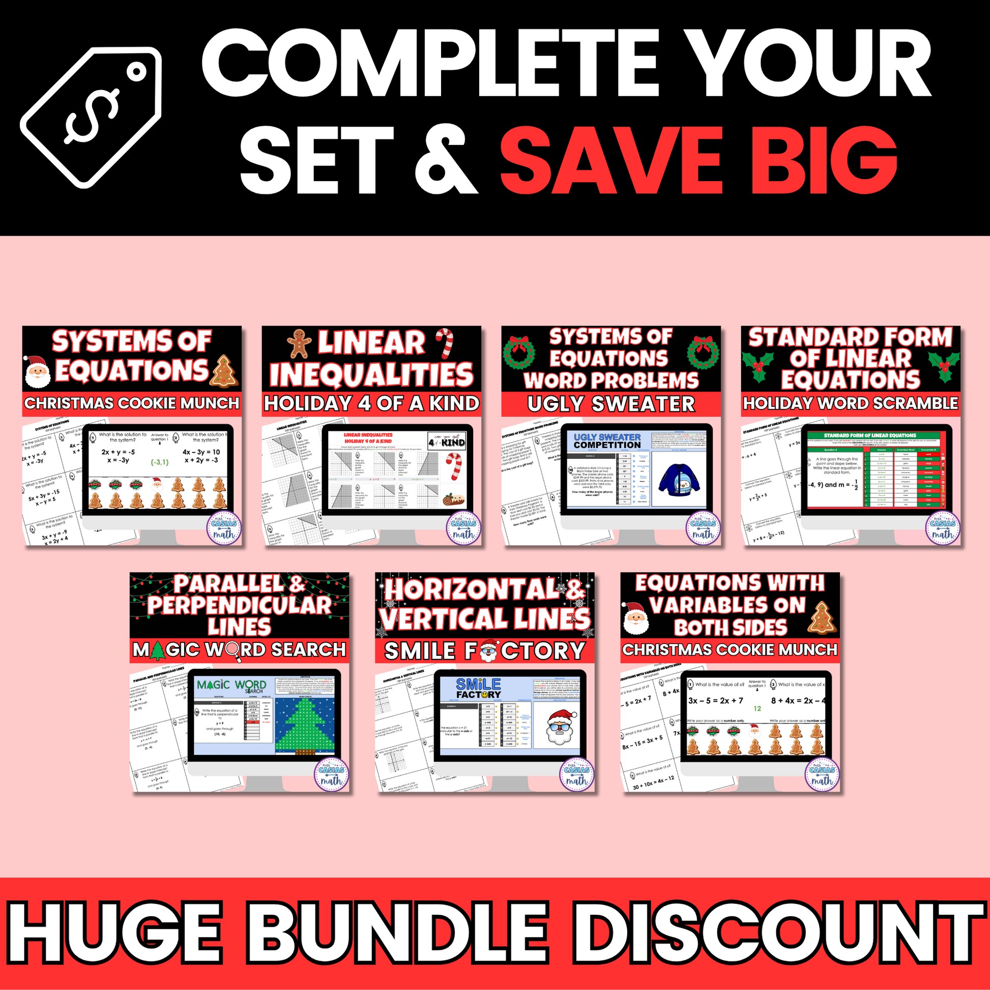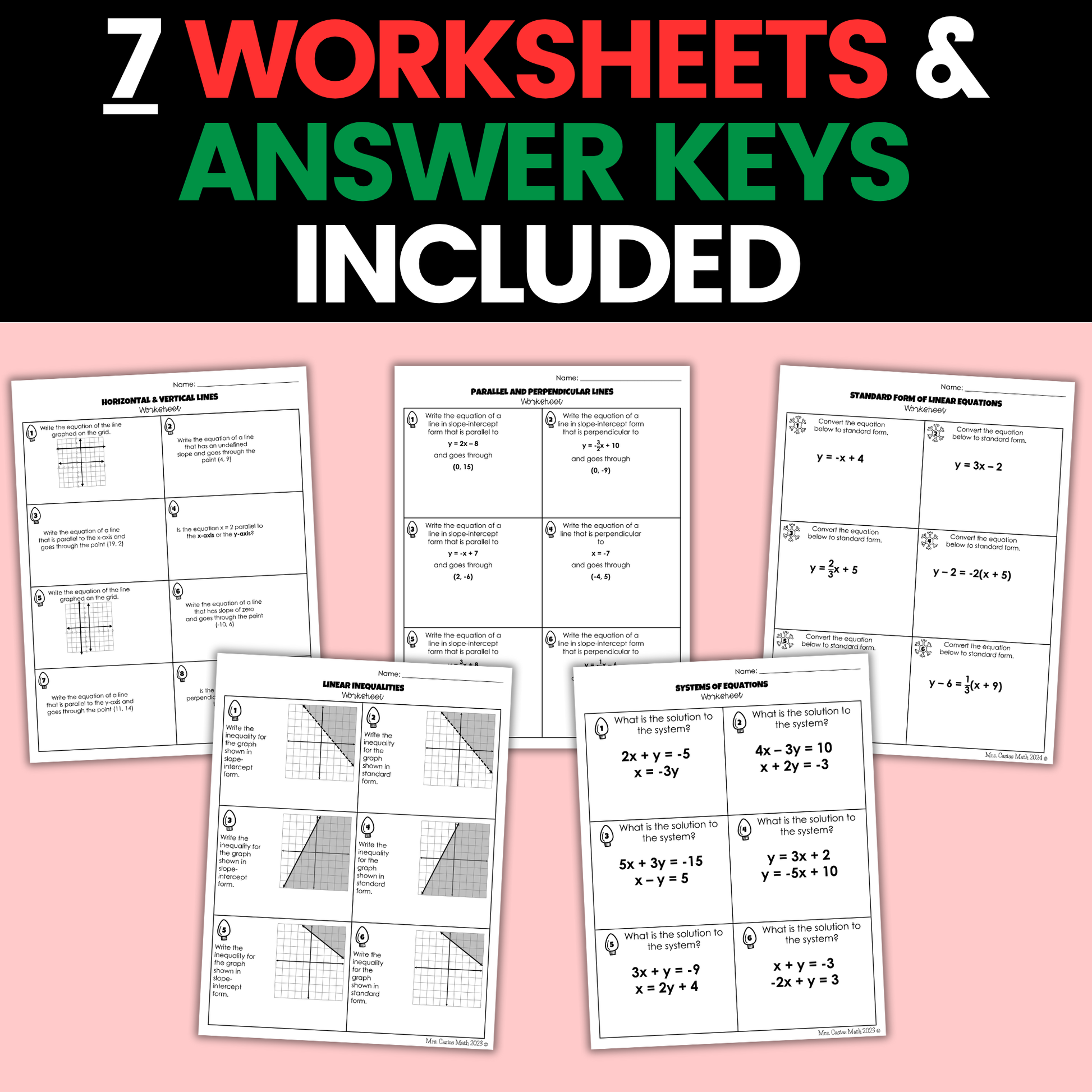 Students will practice important concepts such as systems of equations, linear equations and inequalities, parallel and perpendicular lines, and more—all with a fun Christmas theme.