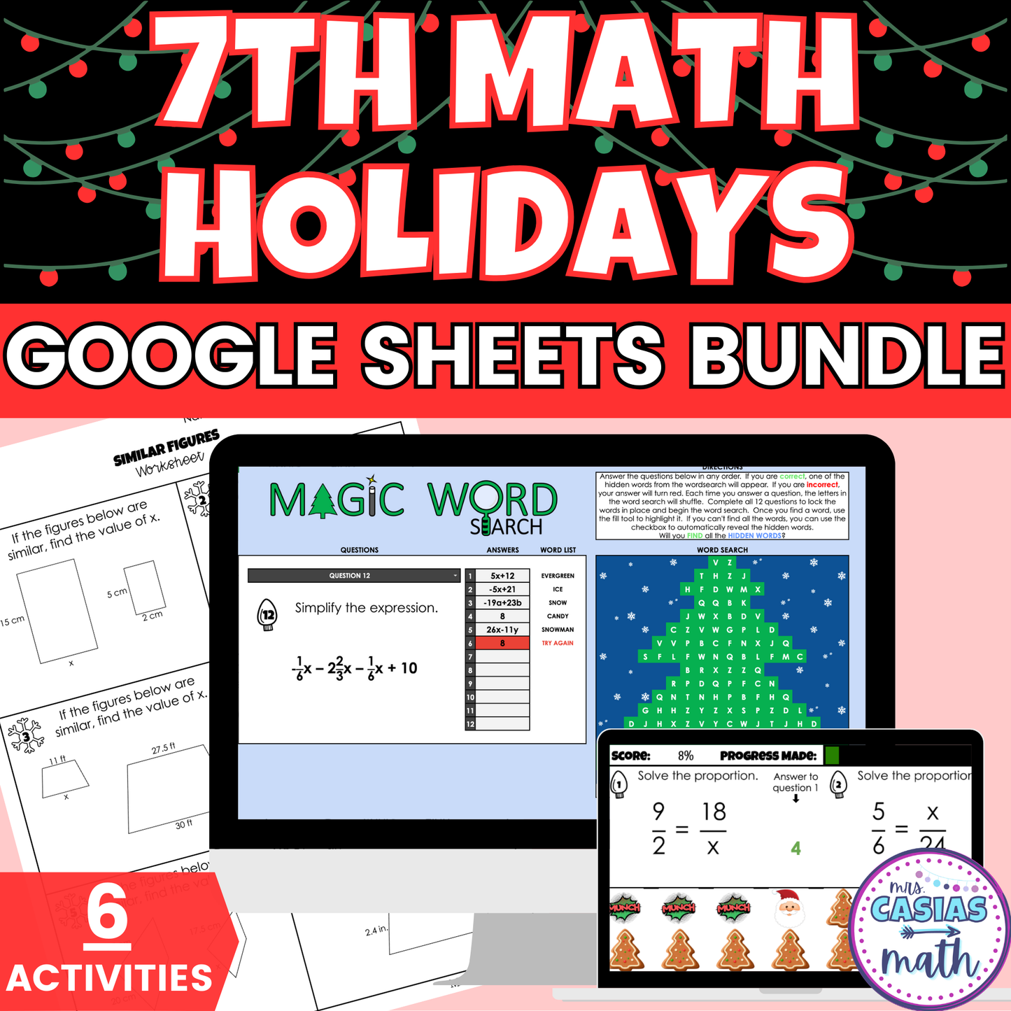 This festive holiday bundle includes seven interactive, self-checking Google Sheets activities and printable worksheets designed for 7th grade math students!