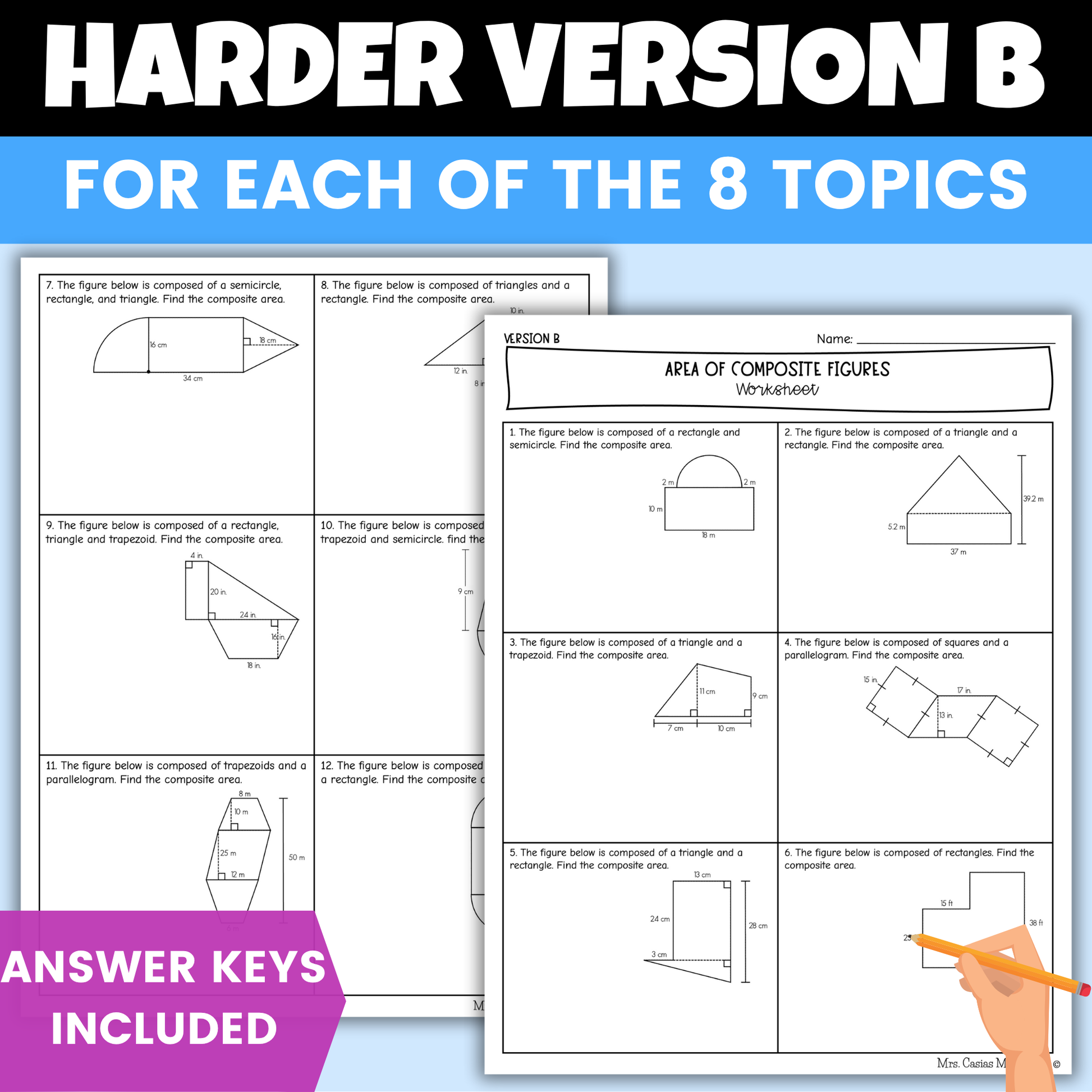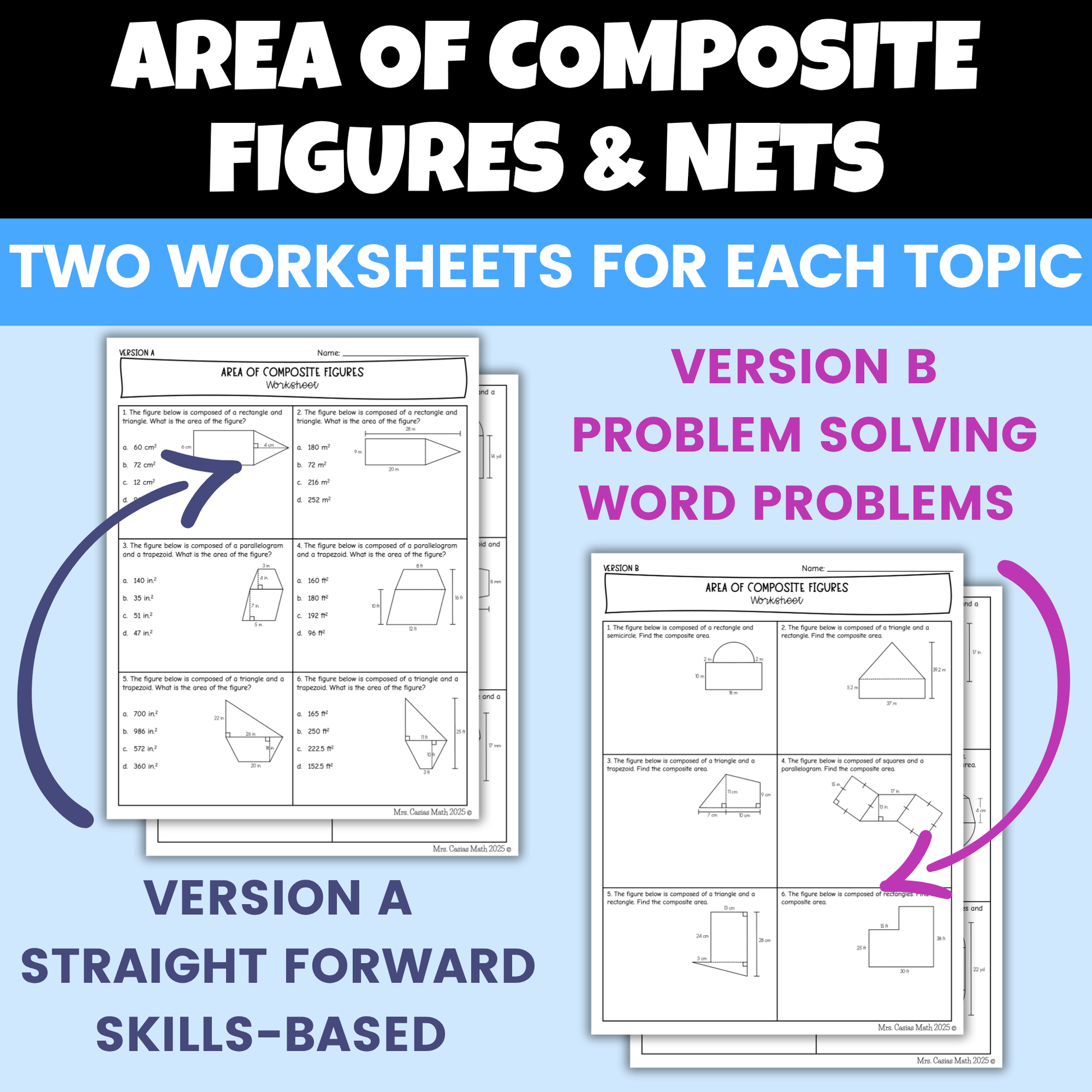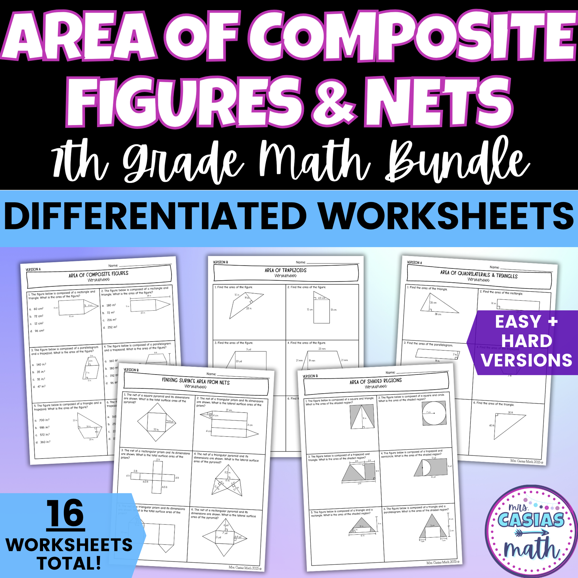 This bundle includes 16 no-prep differentiated Area of Composite Figures and Surface Area of Prisms and Pyramids from Nets worksheets. Each of the 8 topics include two differentiated and leveled worksheets. They are the perfect way for your students to practice finding the area of quadrilaterals and triangles, area of composite figures and shaded regions, and total and lateral surface area of prisms and pyramids from nets, no matter their level as the differentiation is already done for you!