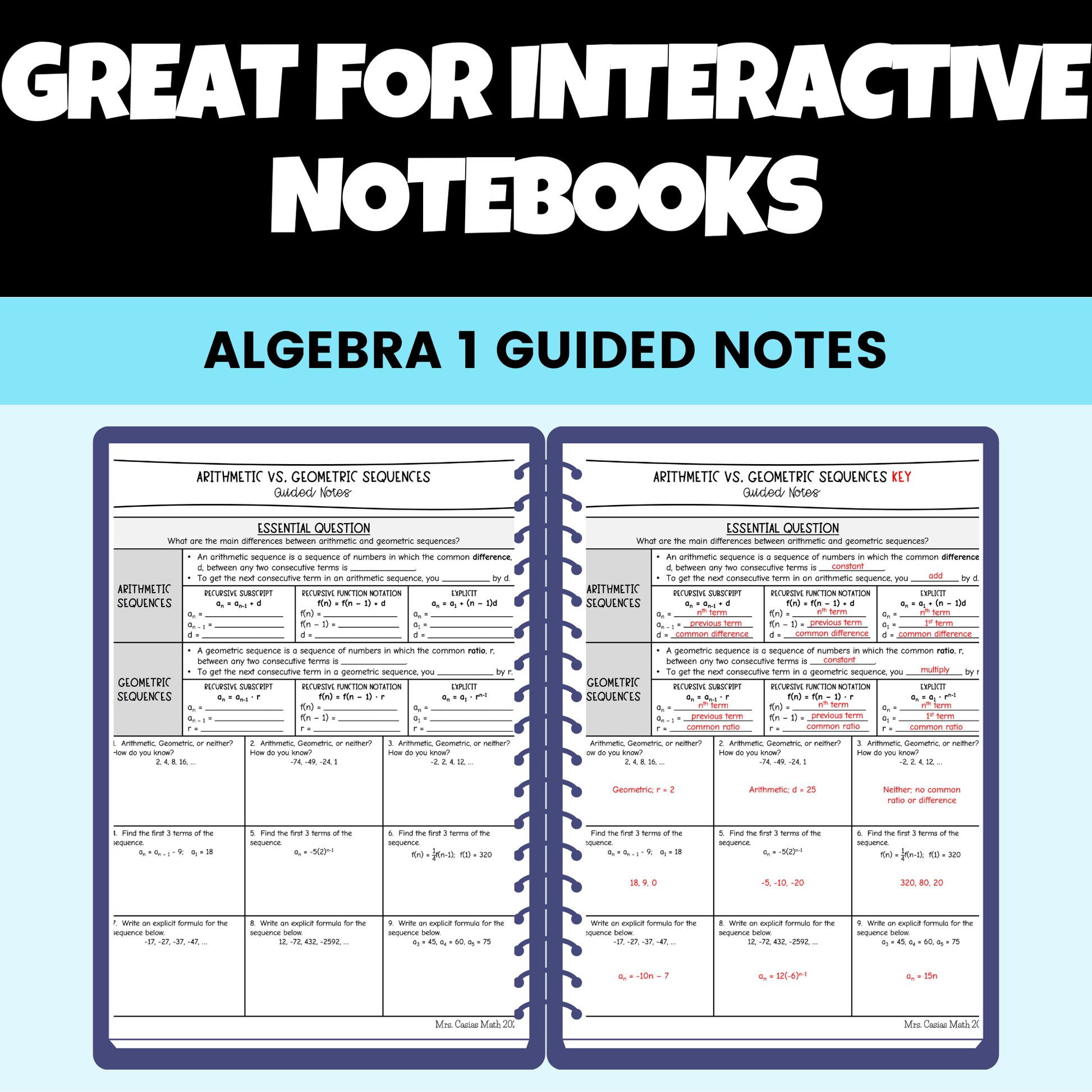 Arithmetic and Geometric Sequences Guided Notes Lessons Algebra 1