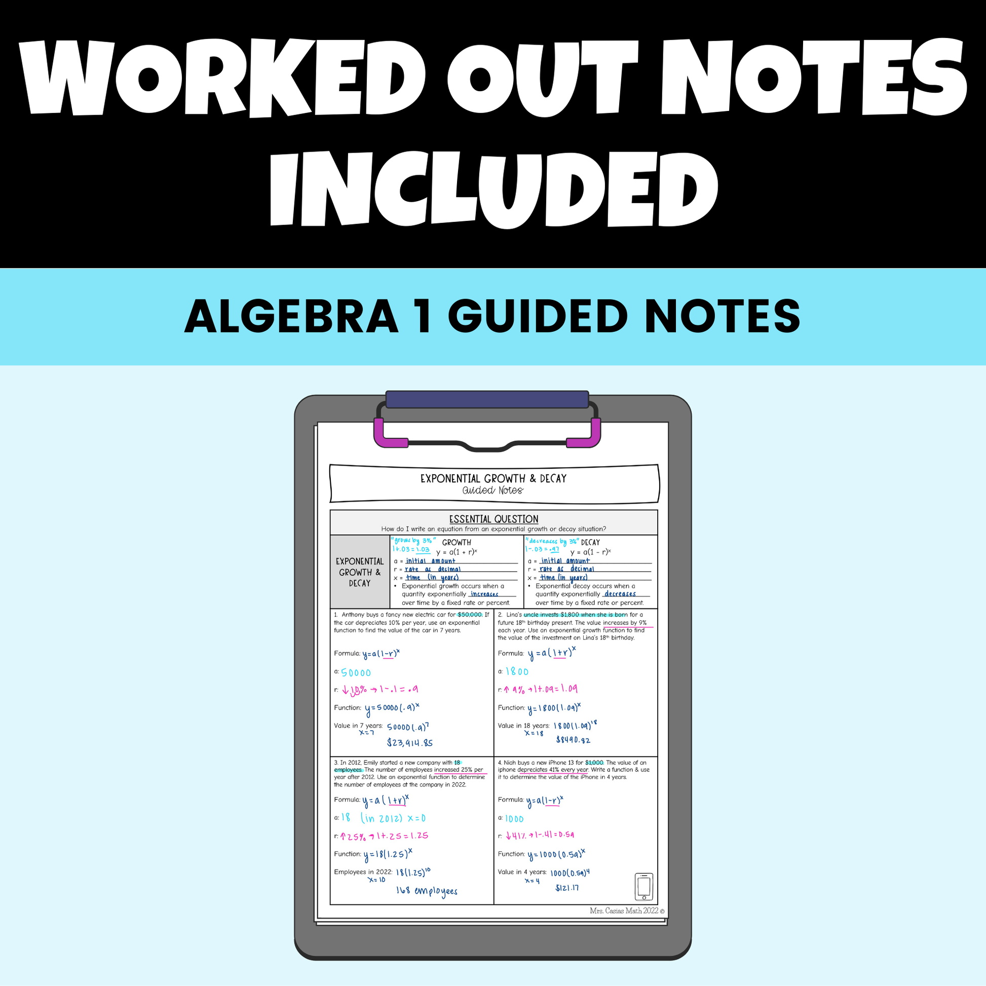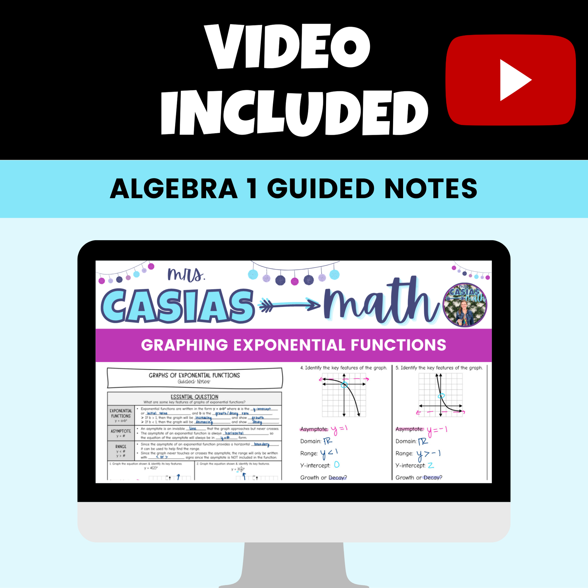 This bundle includes 8 different Algebra 1 lessons over exponential functions. These notes and videos provide fantastic scaffolding by starting out with identifying key features of exponential functions and graphing exponential functions and then move into writing exponential functions from graphs, tables and word problems. This bundle ends with more complex exponential growth & decay and exponential regression lessons. Students and teachers love how easy these notes are to follow and understand.