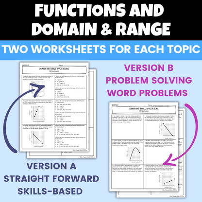 This bundle includes 20 no-prep differentiated Functions and Domain & Range worksheets. Each of the 10 topics include two differentiated and leveled worksheets. They are the perfect way for your students to practice identifying functions, representing functions, domain and range in several different scenarios, association vs. causation and more no matter their level as the differentiation is already done for you!