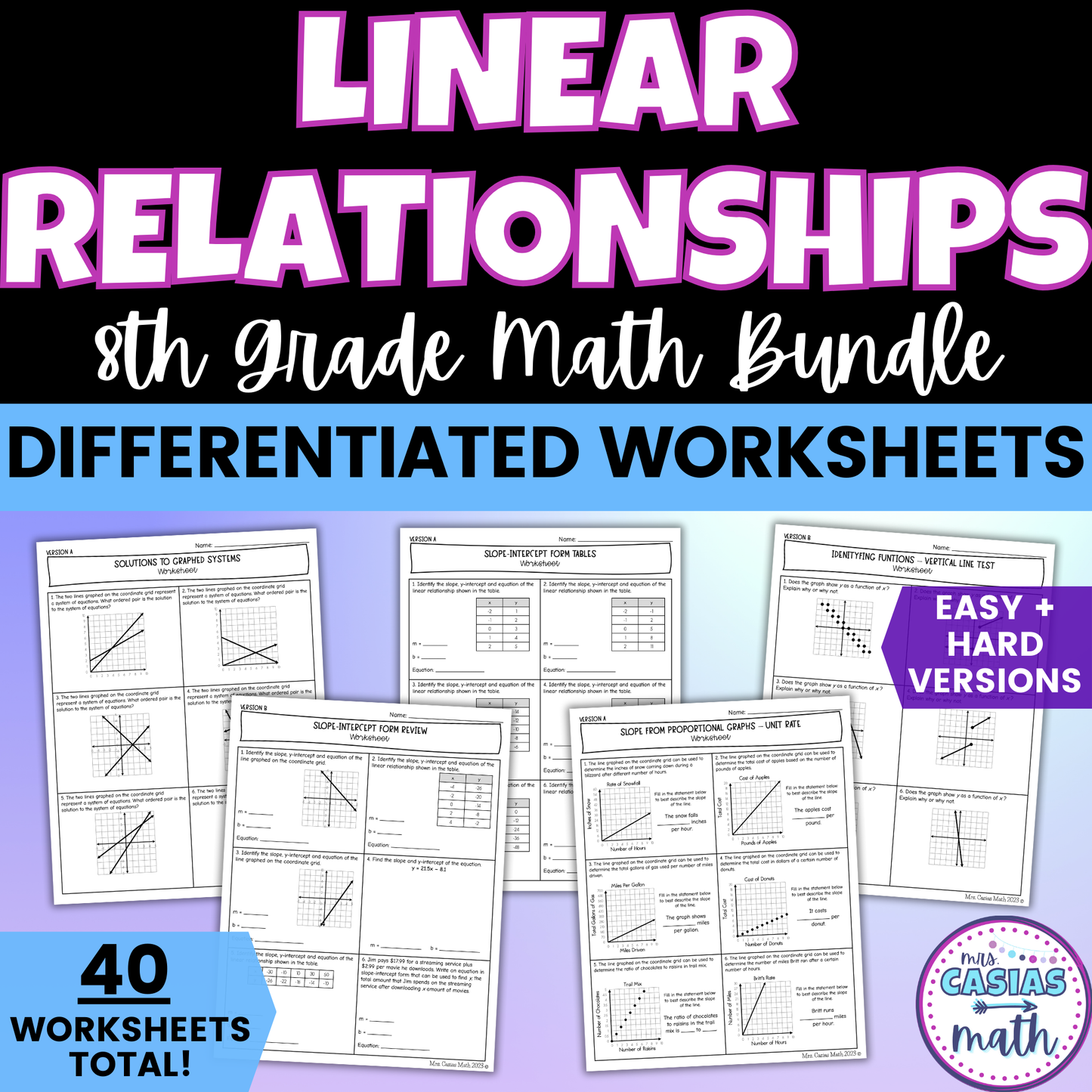 This bundle includes 40 no-prep differentiated Linear Relationships worksheets. Each of the 20 topics include two differentiated and leveled worksheets. They are the perfect way for your students to practice identifying functions, slope, slope-intercept form, proportional vs. non-proportional relationships, and more, no matter their level as the differentiation is already done for you!