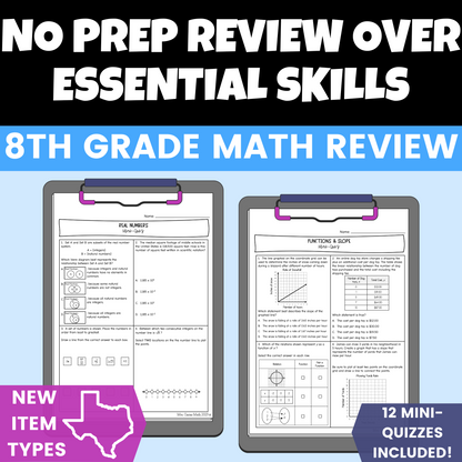 Are you looking for an 8th grade math review that includes the STAAR Redesign new item types? You will find it here with this 8th Grade Math Mini Quizzes Bundle! This bundle includes 12 mini quizzes with four questions each - two questions over the new STAAR 2.0 question types and two multiple choice questions that are very similar to released STAAR questions.