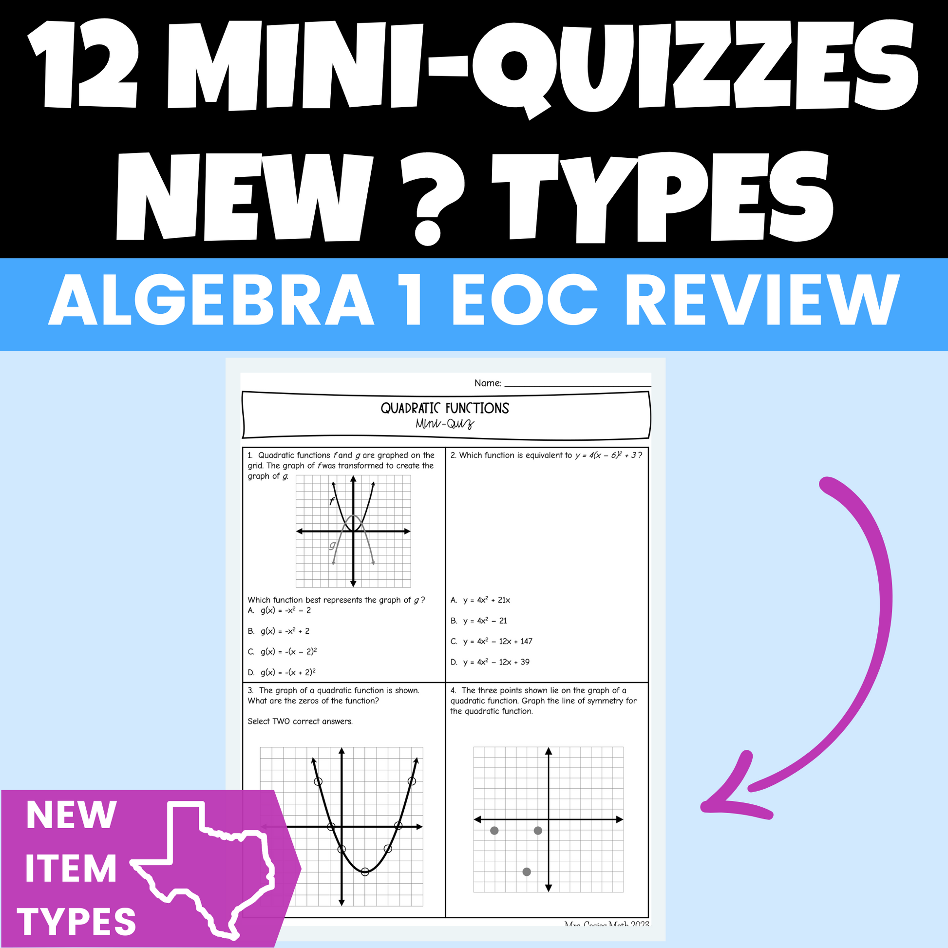 Are you looking for Algebra 1 state test prep over the STAAR Redesign new item types? You will find it here with this Algebra 1 Mini Quizzes Bundle! This bundle includes 12 mini quizzes with four questions each - two questions over the new STAAR 2.0 question types and two multiple choice questions that are very similar to released STAAR questions.
