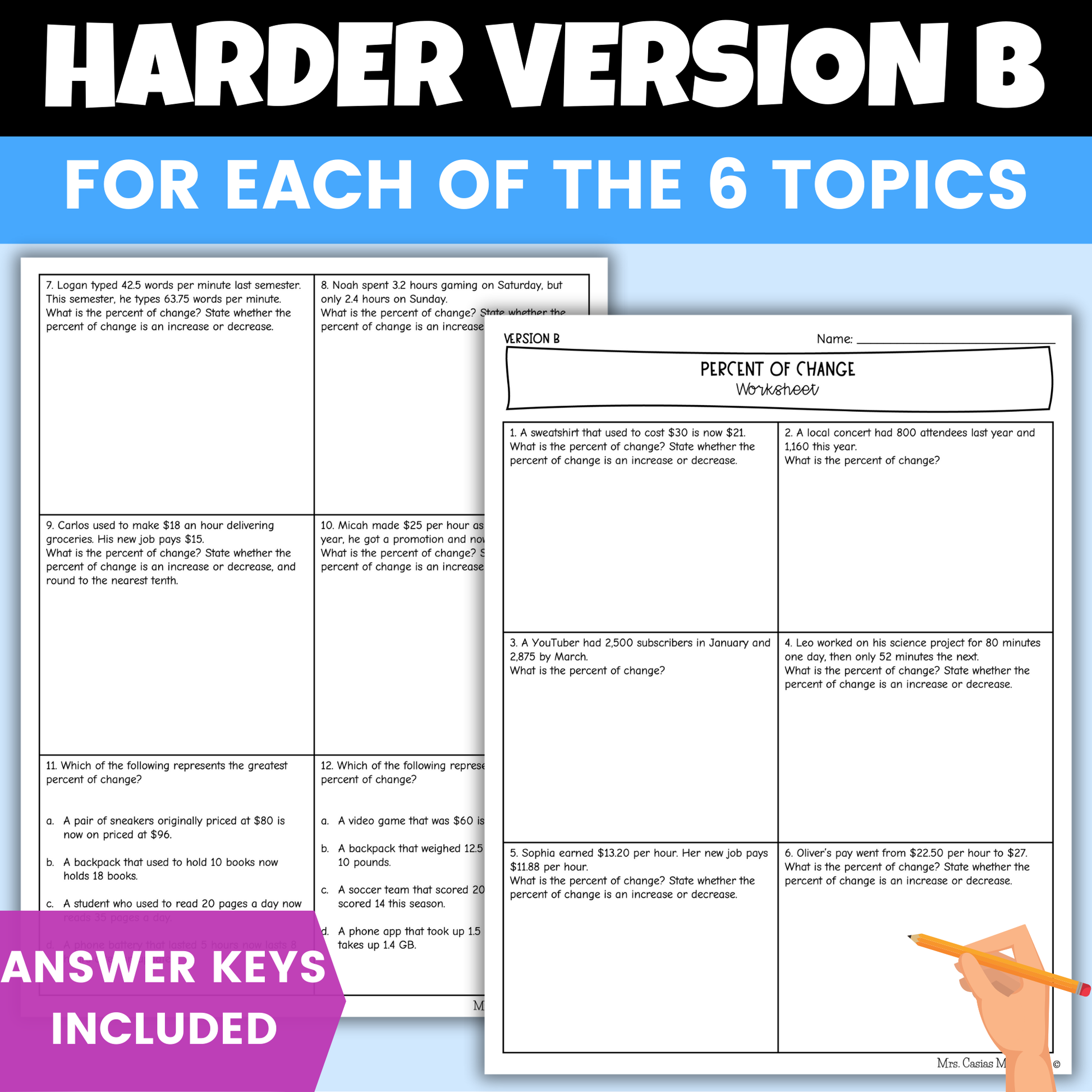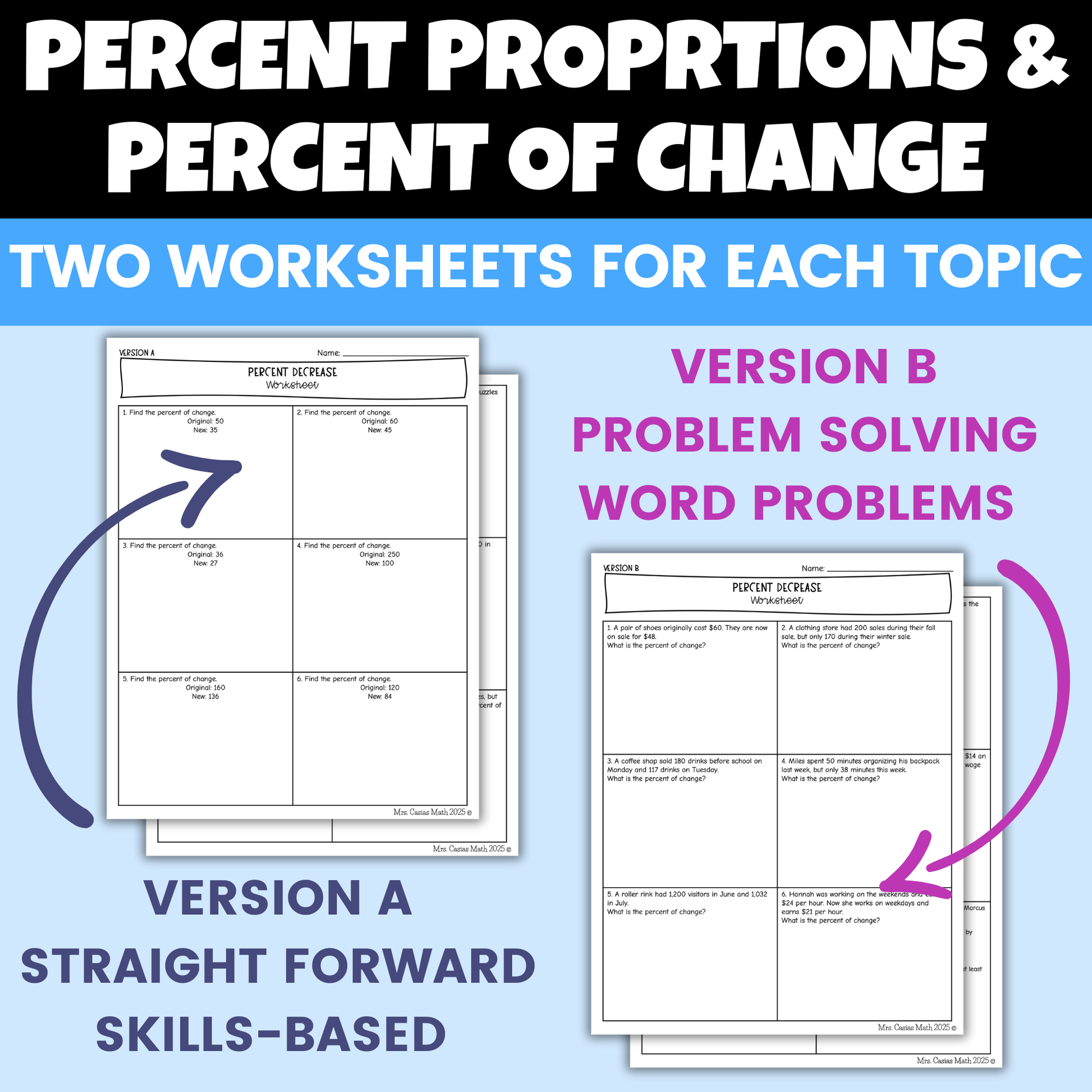 Percent Proportion and Percent of Change Differentiated Worksheets BUNDLE 7th Grade Math