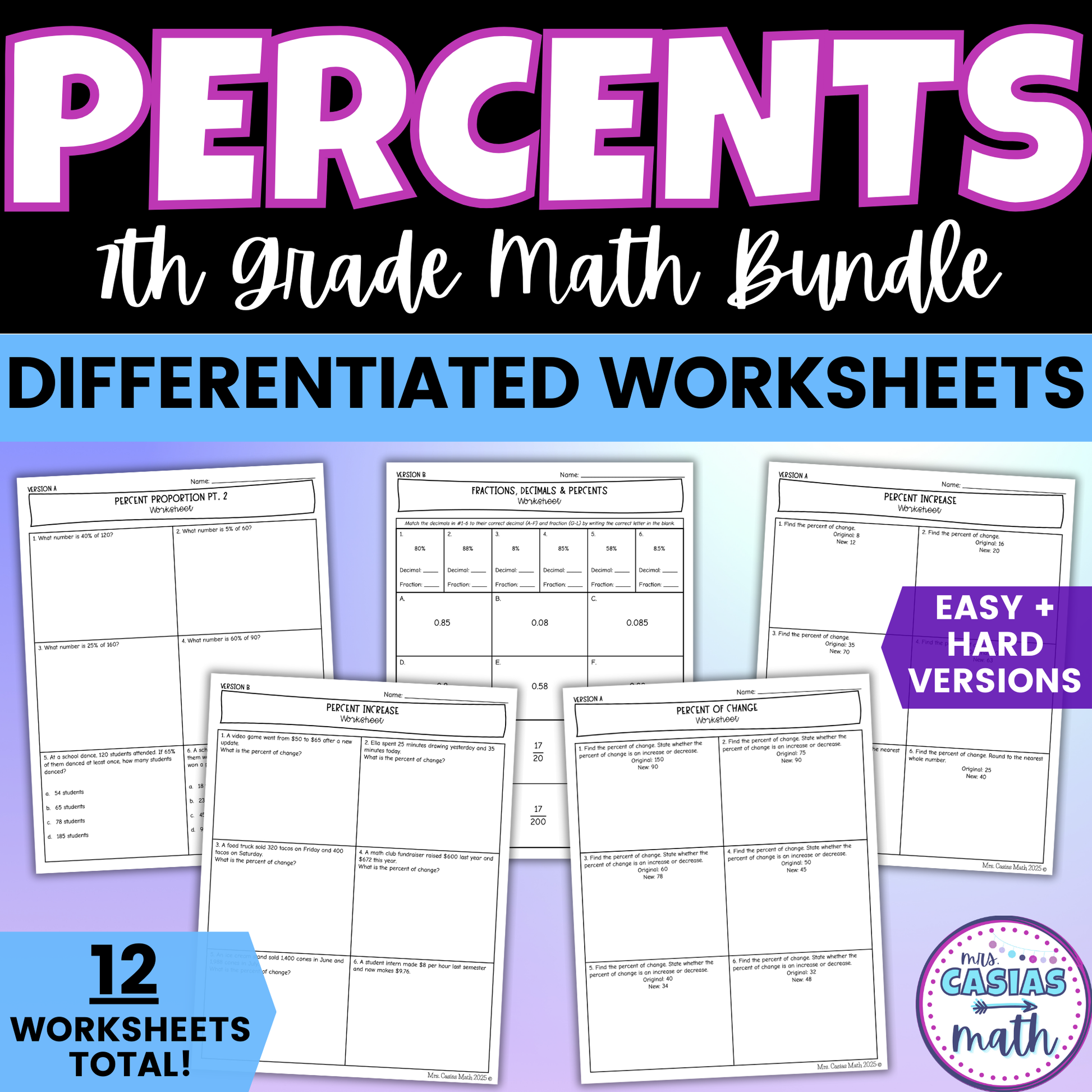 This bundle includes 12 no-prep differentiated Percents worksheets. Each of the 6 topics include two differentiated and leveled worksheets. They are the perfect way for your students to practice solving a percent proportion and finding the percent of change, no matter their level as the differentiation is already done for you!