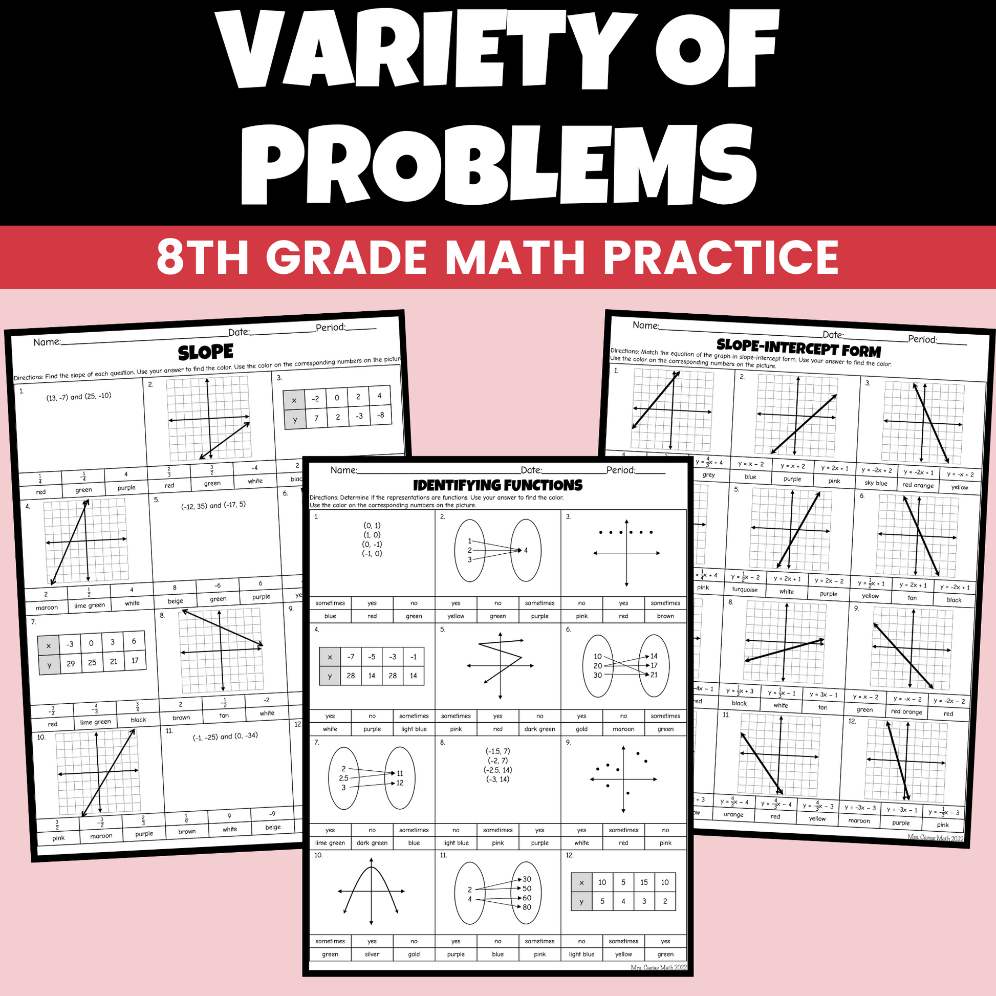 This bundle includes three Winter, Holiday and Christmas Algebra 1 coloring sheets at a reduced price! The worksheets cover slope-intercept form, identifying functions and slope. Your students will be engaged with these coloring activities that require no prep for you!